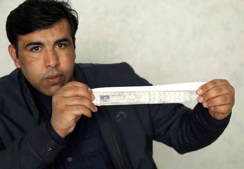17日2月,拉赫丁省祖卢耶镇正在伊拉克北部萨,间所戴的印有一面照片和讯息的身份识别手环阿拉·卡里姆·艾哈迈德闪现他正在被合押期。利勒·达伍德摄新华社发(哈)